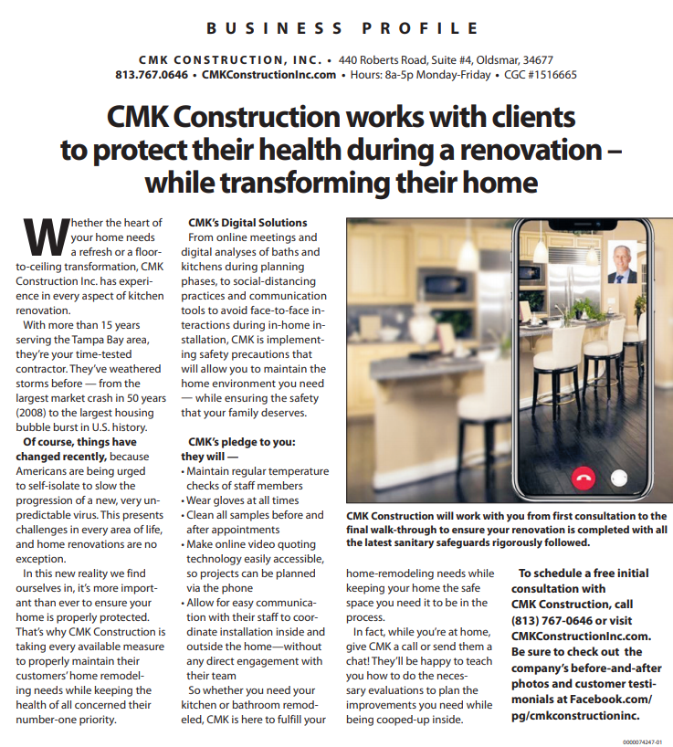 From kitchens and bathrooms to complete home transformations, our commitment to quality, communication, and craftsmanship never changes. No matter the format—face-to-face or online—you’ll still get the same attention to detail, guidance, and care that has made CMK Construction Tampa Bay’s trusted remodeler for over two decades.