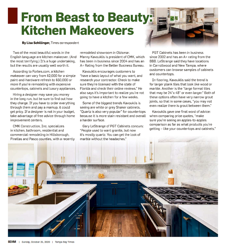 CMK Construction, Inc. specializes in kitchen, bathroom residential and commercial remodeling in Hillsborough, Pinellas and Pasco counties, with recently remodeling showroom in Oldsmar. Manny Kavouklis is president of CMK, which has been in business since 2004 and has an A+ Rating from the Better Business Bureau.
